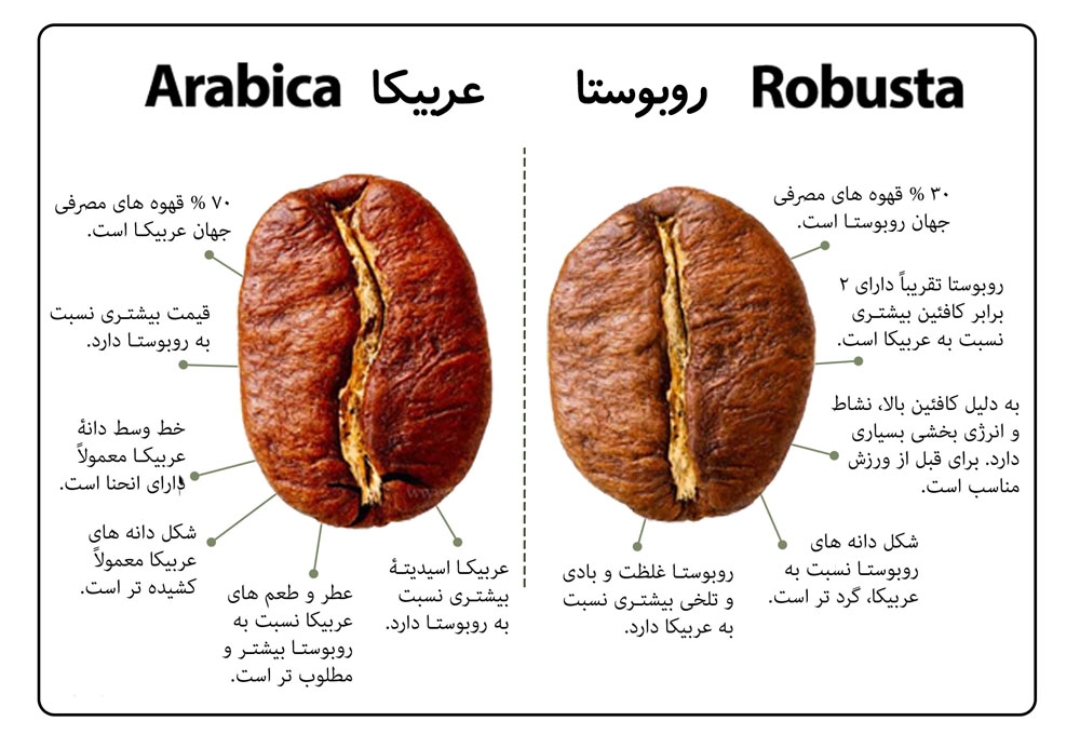 روبوستا: دانههای روبوستا کوچکتر، گردتر و با شیار مرکزی صافتر هستند. طعم آنها قویتر، تلختر و کافئین بالاتری دارد. روبوستا برای کسانی که قهوه غلیظ، تلخ و با کرمای بیشتر دوست دارند انتخاب مناسبی است. همچنین قیمت آن نسبت به عربیکا مقرونبهصرفهتر است.